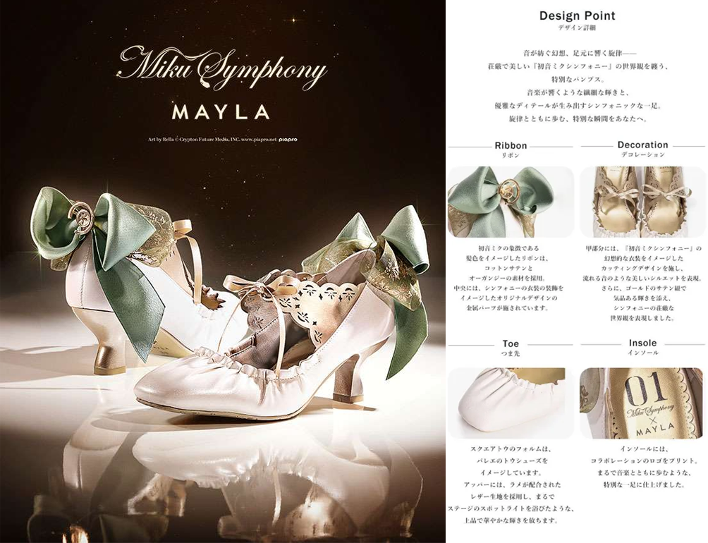 Mayla has collaborated with Hatsune Miku in the past on a series of products, including shoes, jackets, and other apparel.